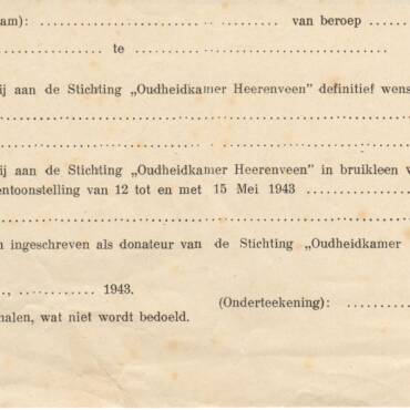 In 1943 ontstaat het plan om de verzamelde objecten tentoon te stellen in Hotel Groen. Hoewel men inmiddels beschikking heeft over enkele vitrines van het Fries Museum, kan de tentoonstelling op het laatste moment niet doorgaan. Er is een politieverordening afgekondigd voor een samenscholingsverbod.
