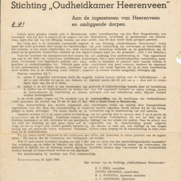 In 1938 wordt de Commissie Oudheidkamer opgericht. Een oproep in de lokale kranten om tijdelijk of definitief bronnenmateriaal en objecten af te staan voor de oudheidkamer kan rekenen op veel belangstelling en instemming. De gebrachte objecten worden bij de commissieleden op zolderkamers bewaard. De meeste voorbereidingen voor een oudheidkamerorganisatie worden door de oorlogsomstandigheden in het geheim tot stand gebracht. Vanaf 1941 mogen voorwerpen worden opgeslagen in het arrestantenlokaal van Tjalleberd. Een plek om de voorwerpen aan het publiek te tonen is er nog niet. Op 22 oktober 1942 passeert notaris J.J. van der Heij de stichtingsacte en daarmee was de Oudheidkamer een feit.
