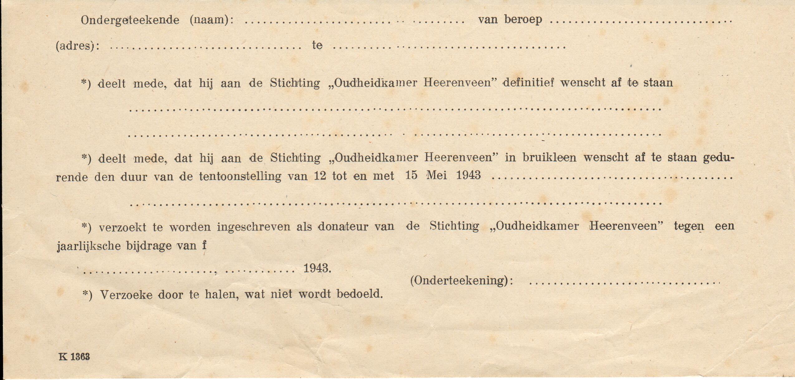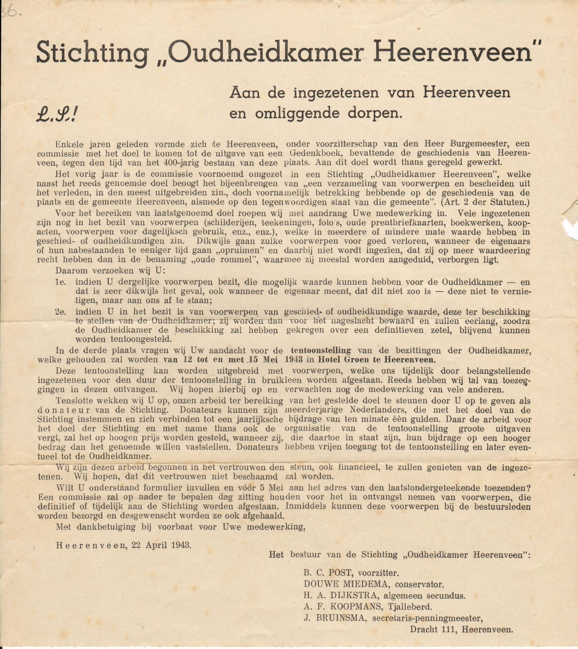 In 1943 ontstaat het plan om de verzamelde objecten tentoon te stellen in Hotel Groen. Hoewel men inmiddels beschikking heeft over enkele vitrines van het Fries Museum, kan de tentoonstelling op het laatste moment niet doorgaan. Er is een politieverordening afgekondigd voor een samenscholingsverbod.