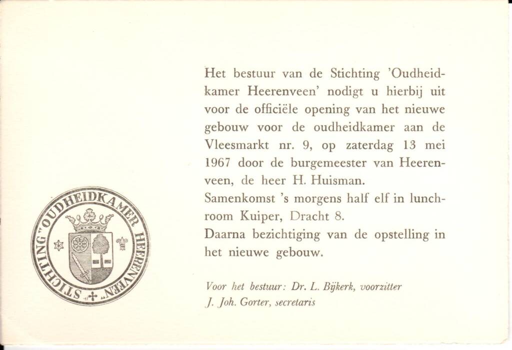 13 mei 1967 omstreeks half 12 opent burgemeester Huisman de nieuwe Oudheidkamer. Deze nieuwe plek blijkt aanmerkelijk aantrekkelijker te zijn voor bezoekers, het jaarlijkse bezoekersaantal stijgt behoorlijk. Op de begane grond zijn presentaties van archeologische vondsten, de vervening, scheepvaart, landbouw en de ambachten. Op de eerste verdieping zijn stijlkamers gerealiseerd. Zo is de inrichting van de burgemeesterskamer te zien. Tussen de vaste presentatie worden de tentoonstellingen geplaatst.